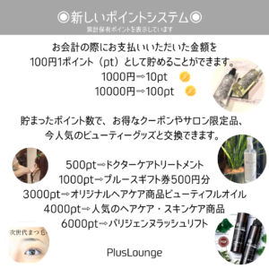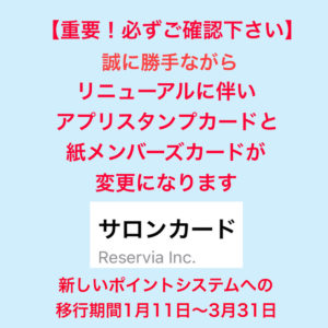 新しいポイントへの移行・還元についてはスタッフが行いますので、お気軽にお申し付けください。これからもお客様にとって心地良い空間と技術、サービスを心がけて参ります。お手数お掛けしますがどうぞご理解の程宜しくお願い申し上げます。