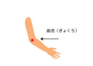 曲池はひじを曲げたとき、外側にできるしわの延長線上にあります。ひじの骨の少し手前です。
