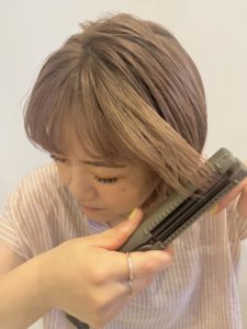 ③束感や隙間感や動きをだしたい部分に、リファ前髪ロックを指の先につけていきます